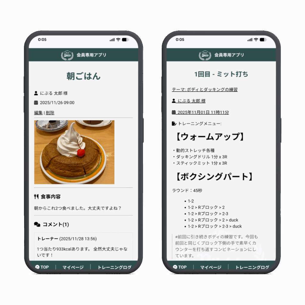 Ruby on Railsによる自社開発の顧客管理・トレーニング支援システム。 顧客カルテ、トレーニングログ、食事指導機能を一元化し、煩雑な事務作業を大幅に削減。クライアント用マイページ(ログイン機能)の実装により、双方向のデータ共有をスムーズに実現しました。 自社ジムにてサブスクリプションモデル(SaaS)として運用し、収益化と業務効率化の両立に成功しています。