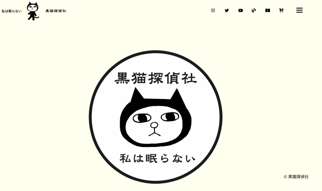 黒猫探偵社様の作品世界観を尊重し、キャラクターが主役となるシンプルなデザインで構築。 ヘッダーやハンバーガーメニューにはSNS等の外部リンクを機能的に配置しました。装飾をCSSのみで実装することで、デザイン性を保ちつつストレスのない高速表示を実現しています。
